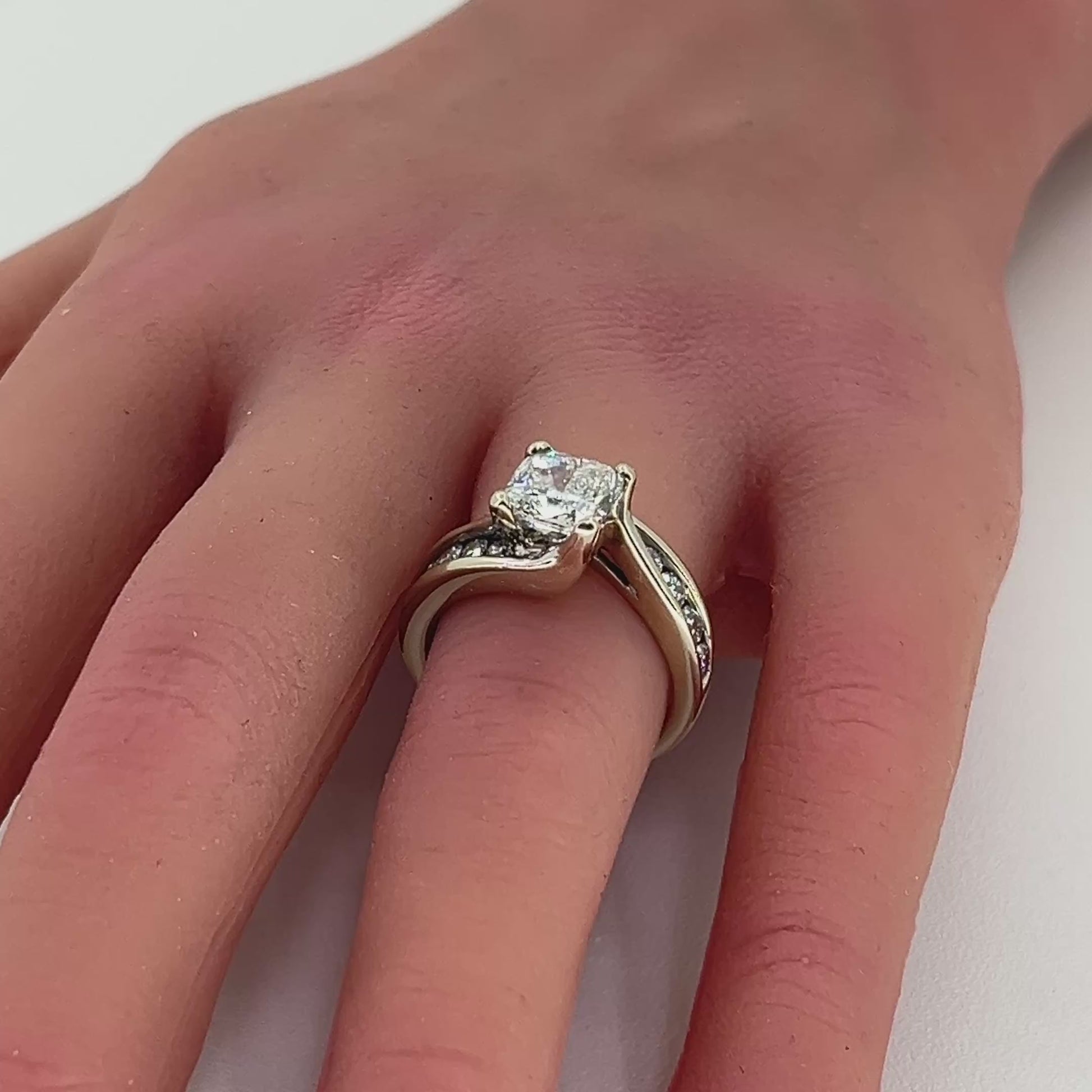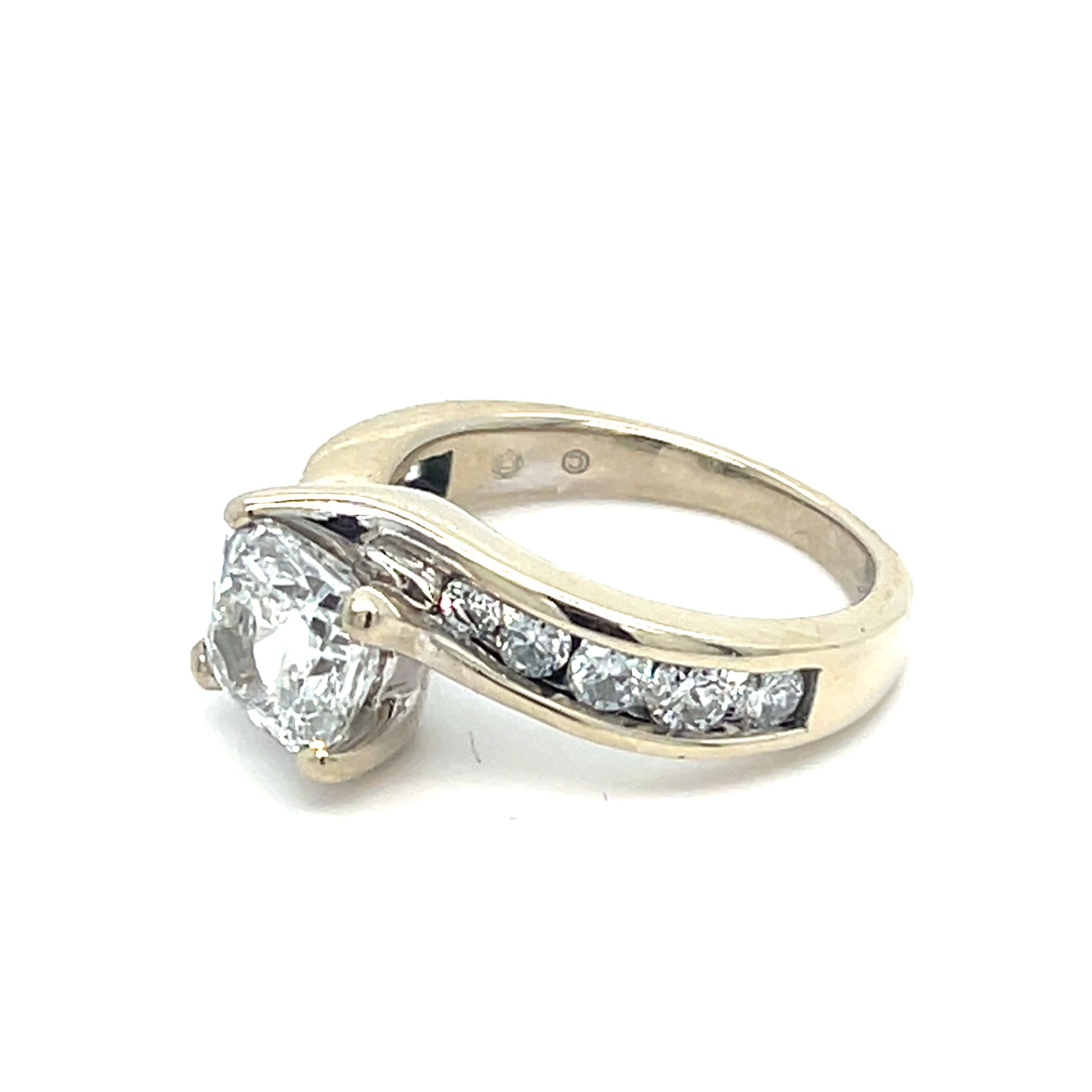This 14K white gold engagement ring features a 2.08 ct cushion cut natural diamond in a four prong setting flanked by 10 round brilliant cut diamonds.