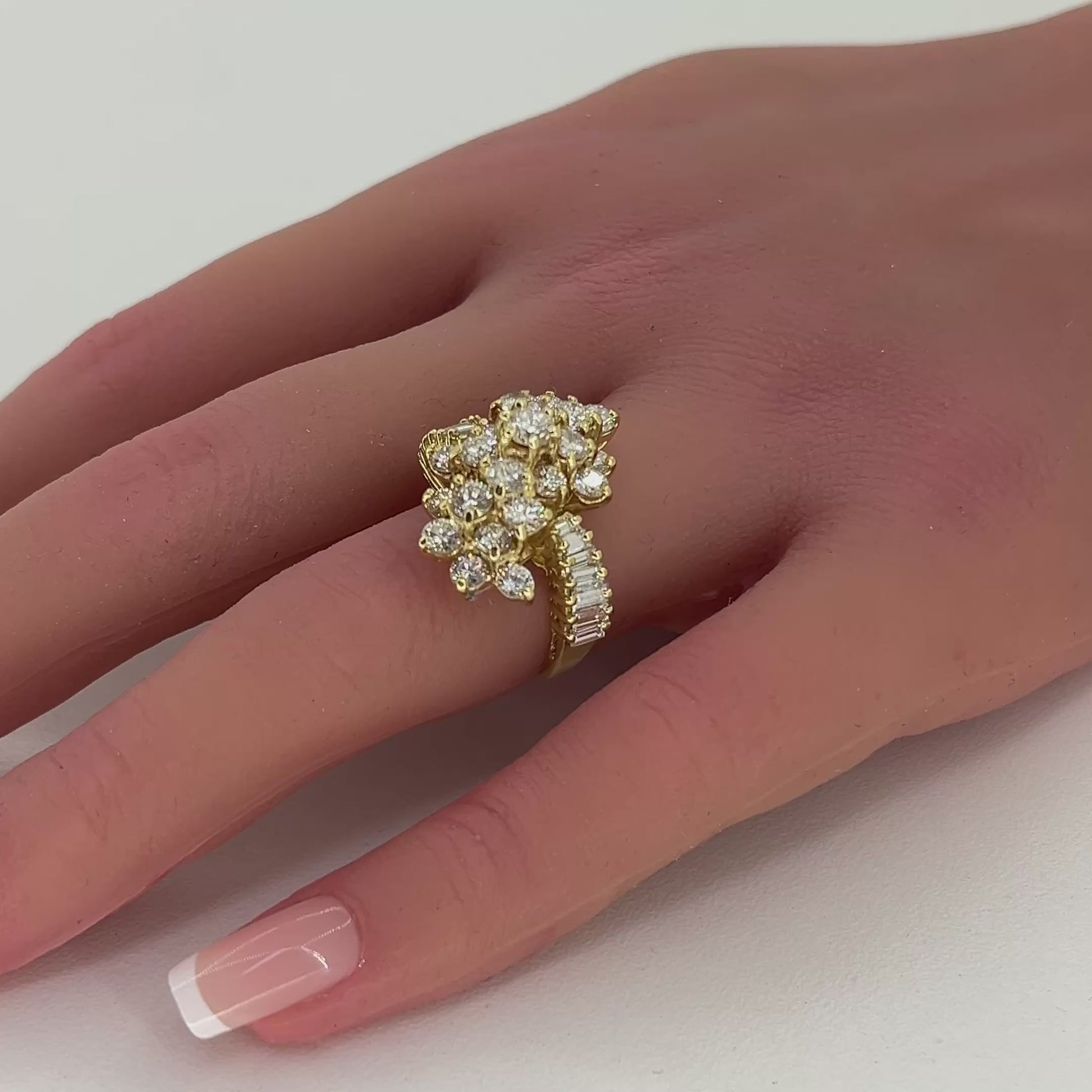 18K Yellow Gold Natural Diamond Cluster Ring Waterfall Style | Round, Baguette diamonds 3.91 TCW H-I color VS clarity, Size 5.5