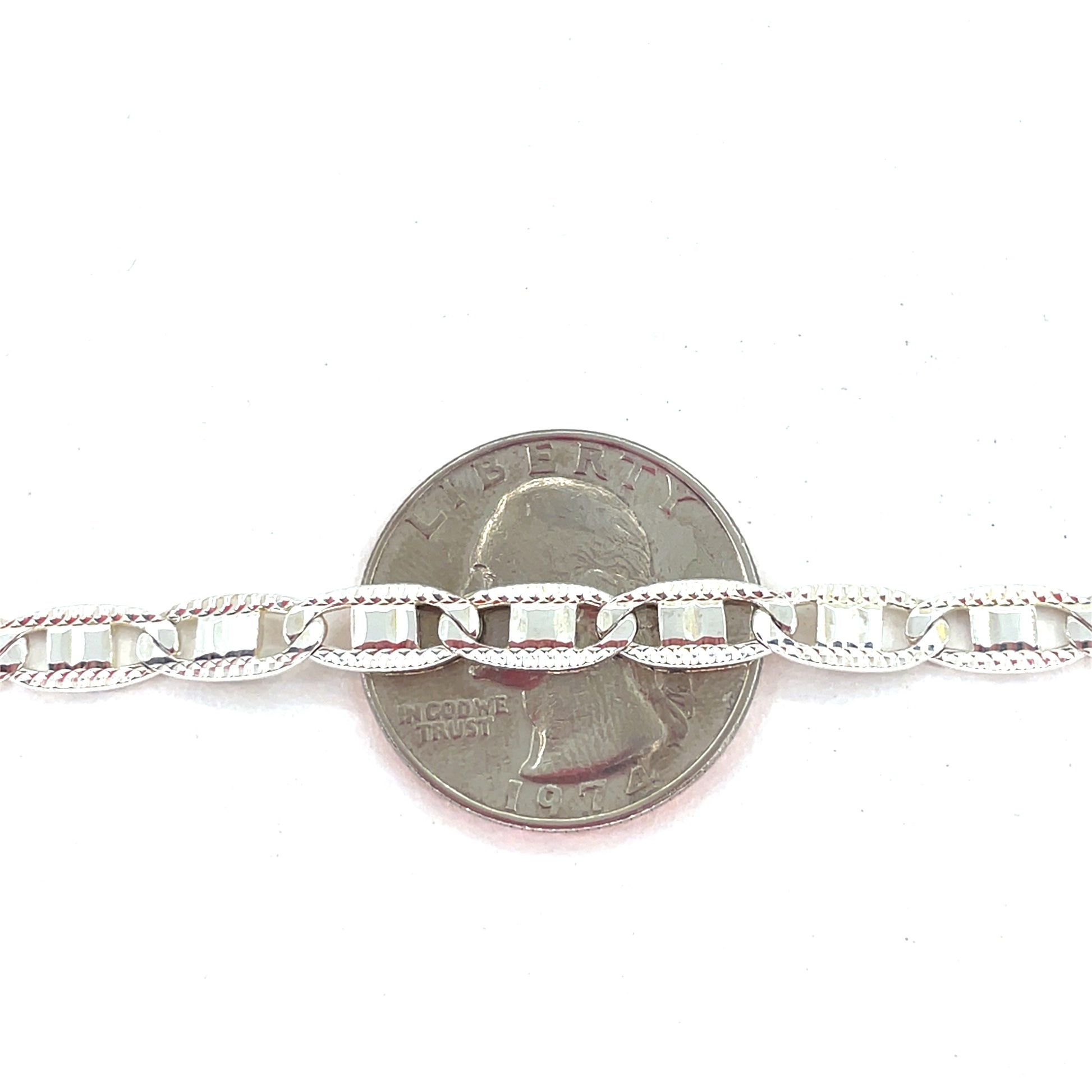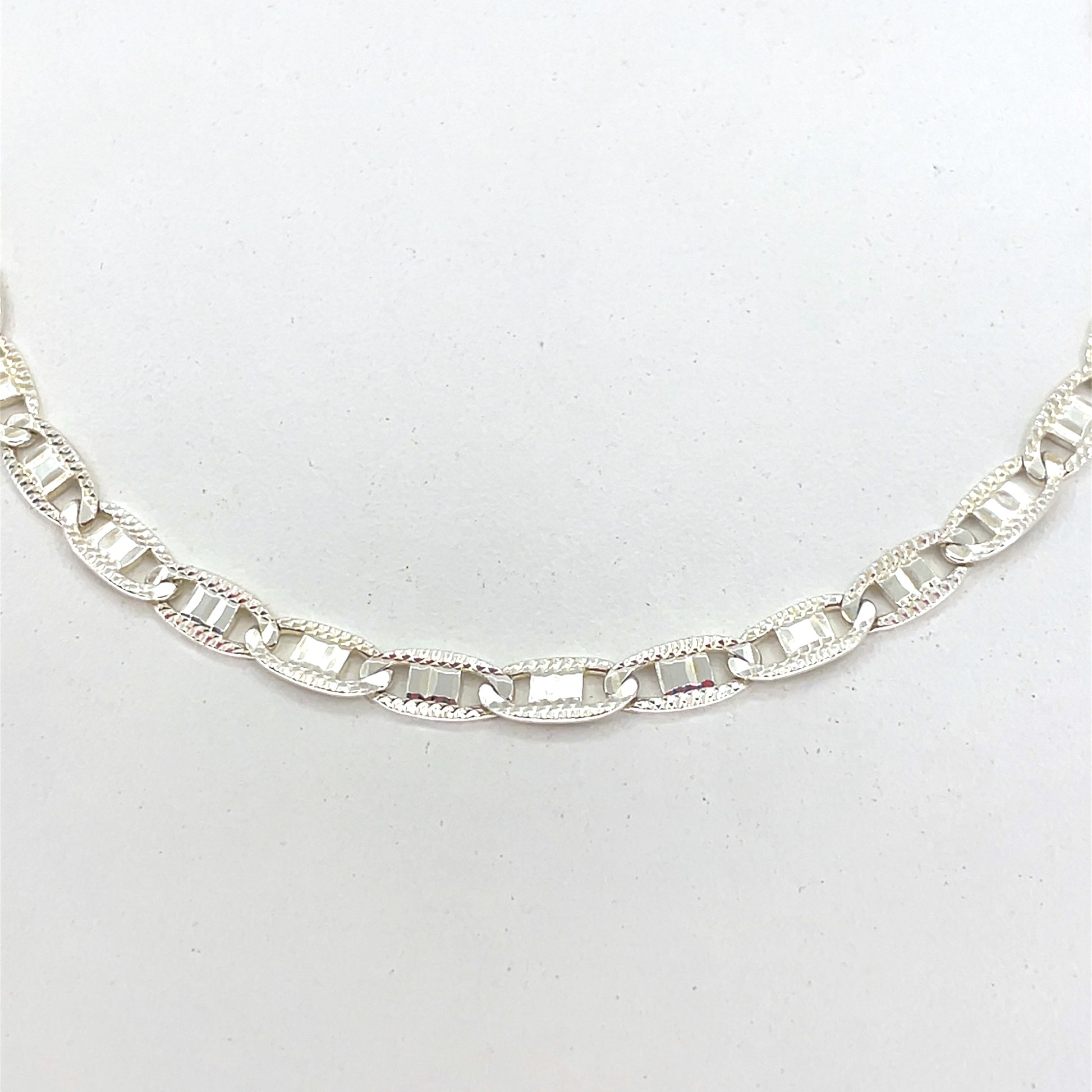 This sterling silver necklace features a clean Valentino-style link design with a polished finish. Designed for everyday wear, it offers a balanced look that works well worn alone or layered.
